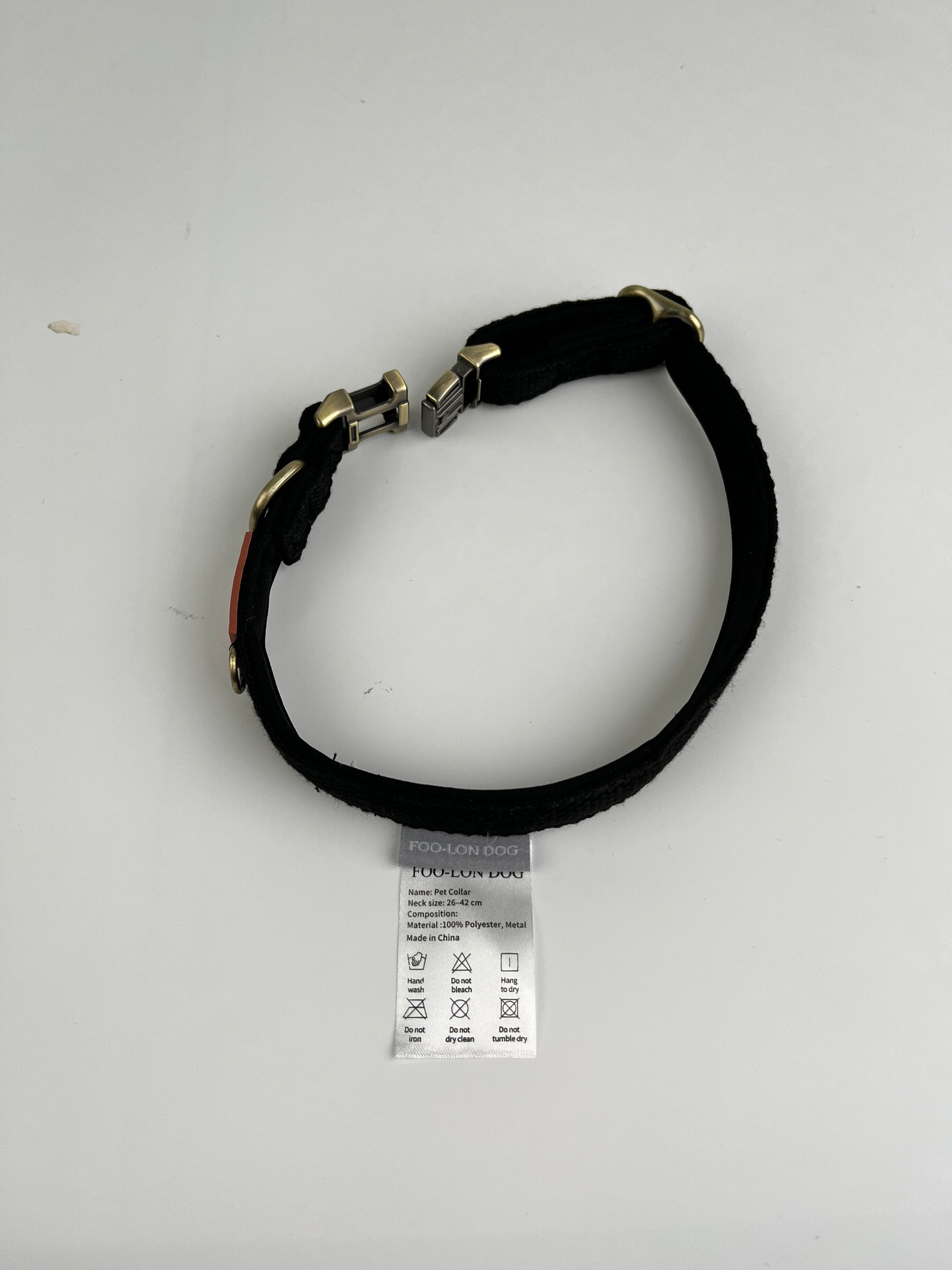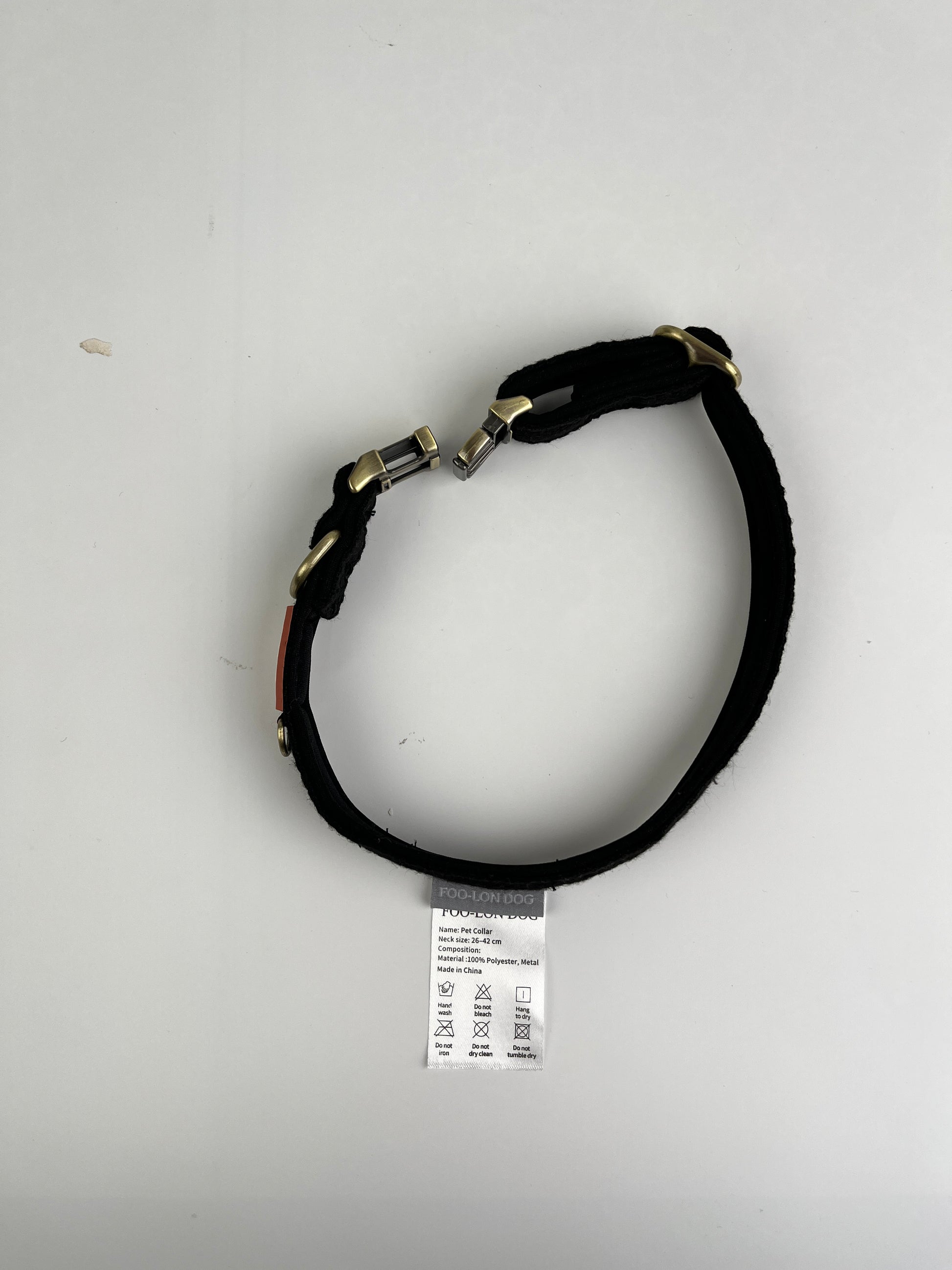 The sleek black fabric paired with brushed metal accents and a discreet FOO-LON DOG logo tag adds a modern touch to your pet’s everyday wear — elegant, simple, and built to last.