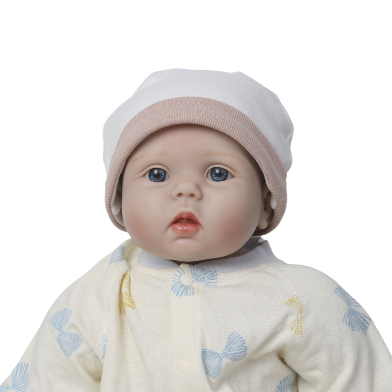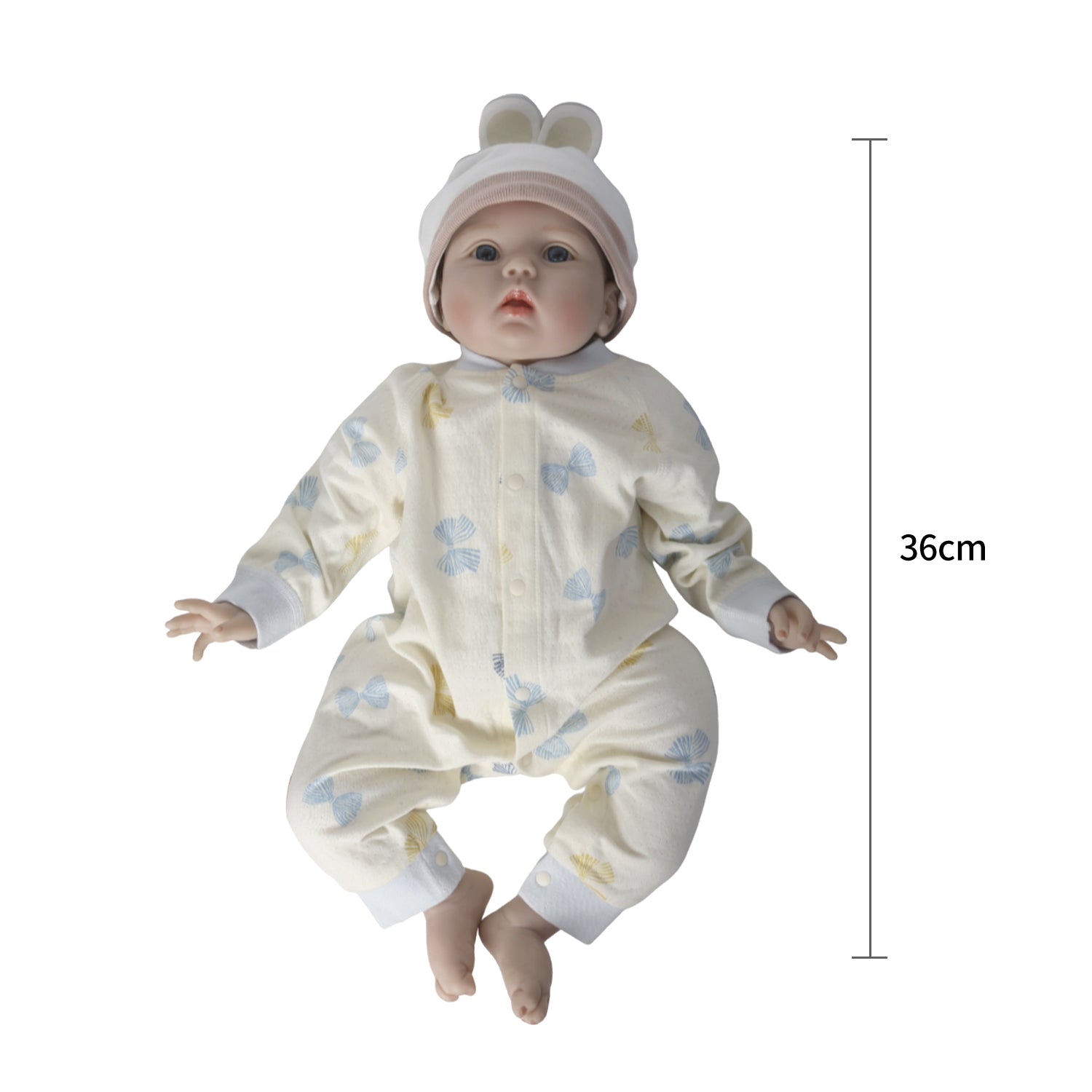 Complete Outfit: Comes dressed in a removable cotton onesie with a pastel bow print and a soft baby hat.